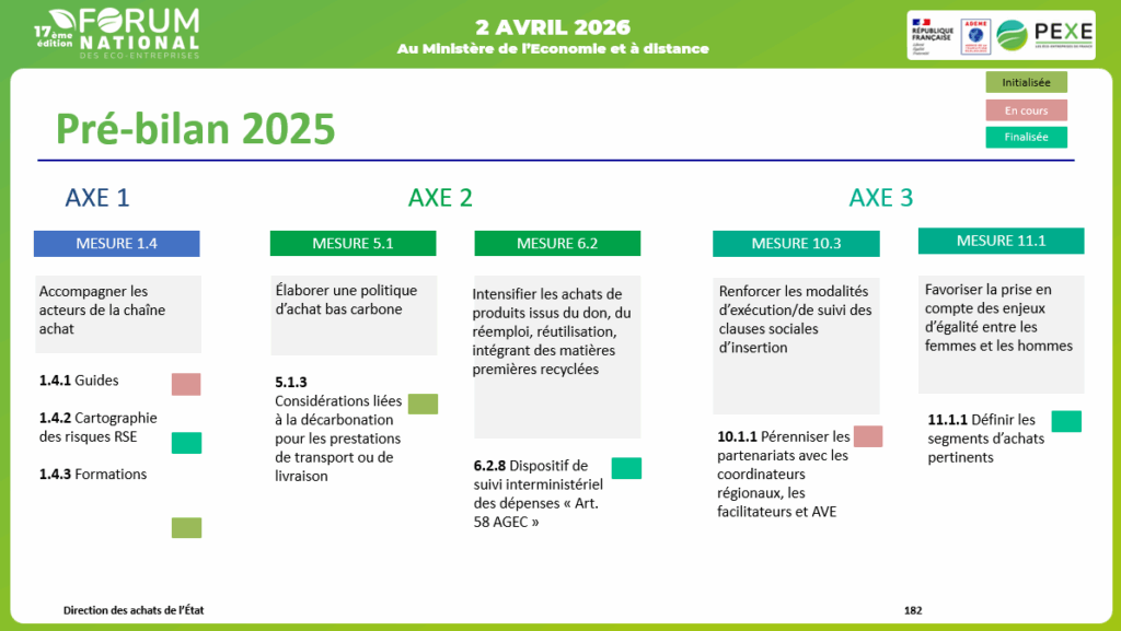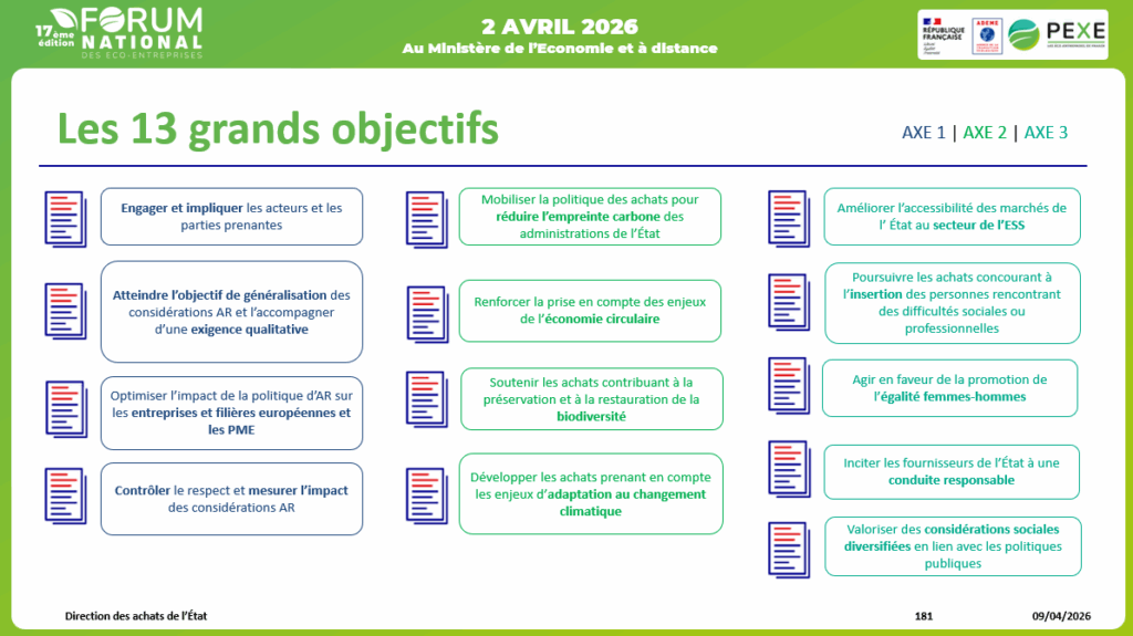 Lors du Forum national des éco-entreprises 2026, une séquence était dédiée aux achats responsables et innovants. Celle-ci fut animée par l’adjointe Cheffe du bureau achats responsables de la Direction des Achats de l’Etat, qui présenta le Schéma de Promotion des Achats Publics Socialement et Écologiquement Responsables (SPASER) de l’Etat 2025-2027.