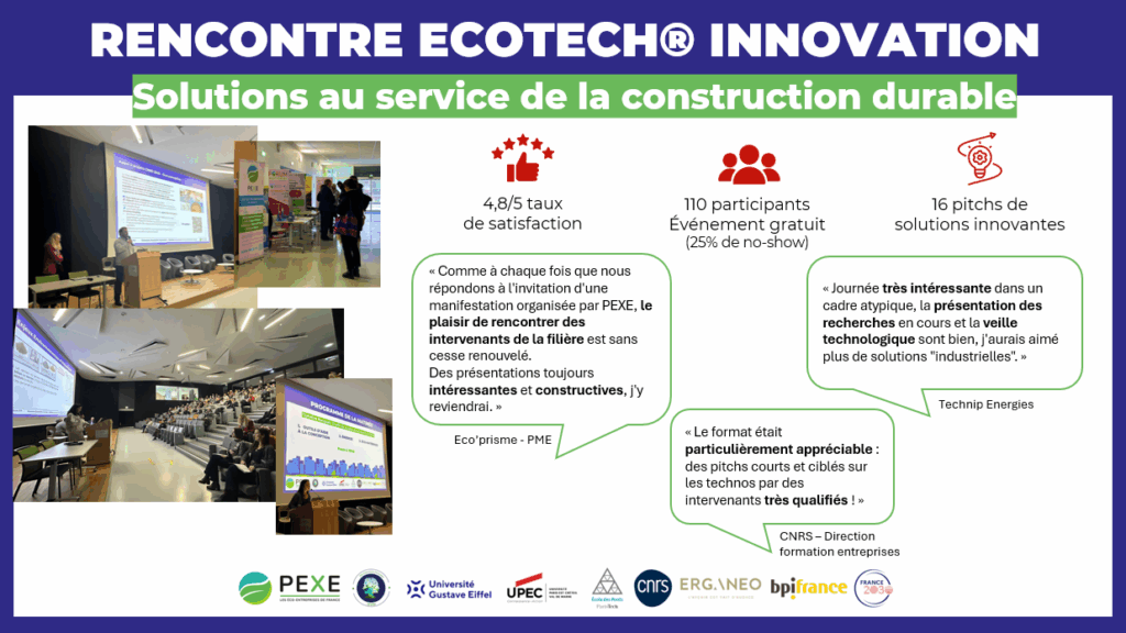 Cet évènement, organisé par le PEXE, le PUI SEVille, l’Université Gustave Eiffel, l’UPEC, l’Ecole des Ponts, le CNRS et Erganeo a rassemblé plus de 110 participants – éco-entreprises, laboratoires de recherche et grands groupes – réunis pour une matinée de pitchs et d’échanges autour des outils d’aide à la conception, des éco-matériaux et de l’énergie.